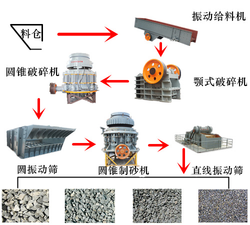 【組成部件】:振動給料機、顎式破碎機、圓錐破碎機、圓振動篩 、圓錐制砂機、直線振動篩